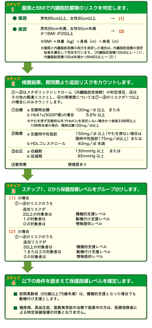 特定健診の結果をもとに、内臓脂肪蓄積の程度とリスク要因の数に着目して、リスクの高さに応じて、レベル別(「動機付け支援」・「積極的支援」)に特定保健指導の対象者の選定を行います(階層化という)。